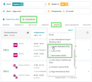 Якщо у вас немає візи Великобританії, то можете відсортувати результати відключивши результати з пересадками у Лондоні та Манчестері: