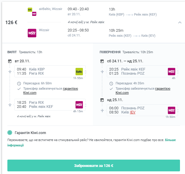Важливо! При пошуку перельотів в Ісландію Kiwi може скласти маршрут з пересадкою у Великобританії. Зауважте, що лоукост авіакомпанії Wizz Air, Ryanair та EasyJet не здійснюють рейсів з пересадками і винятки з візового режиму для транзитних пасажирів відповідно до британської програми Transit without Visa (TWOV) не розповсюджуються на пасажирів лоукостів. Без британської візи вас просто не пустять на літак.