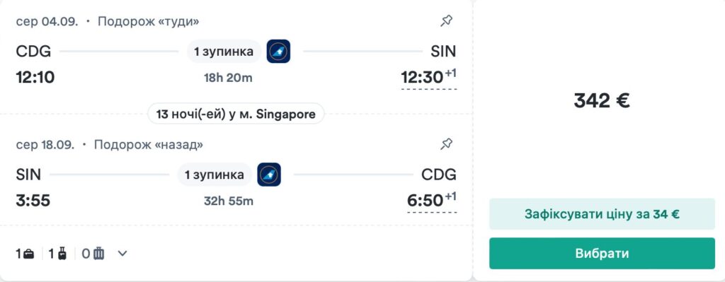 Авіаквитки Париж – Сінгапур від €342 у два боки