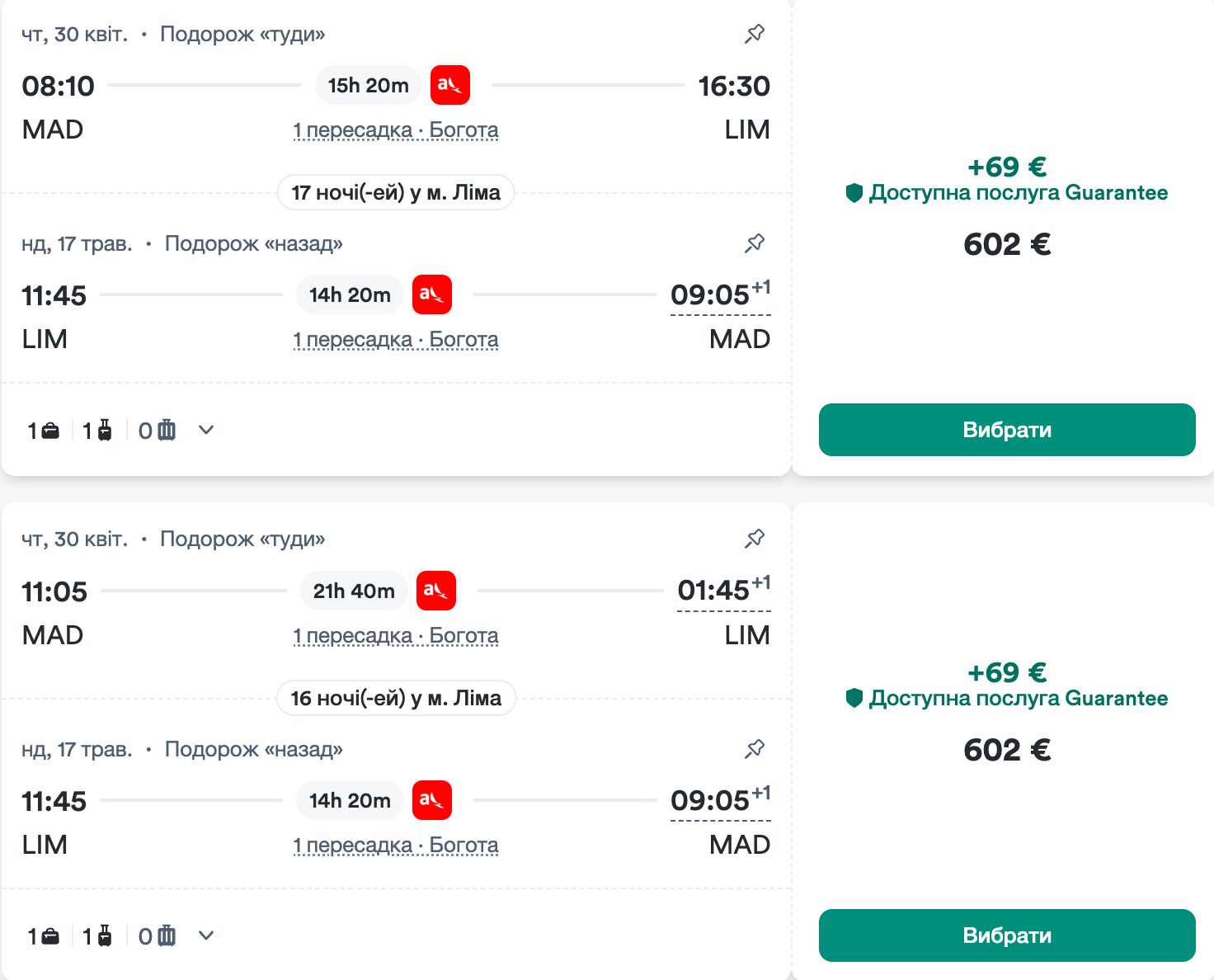Авіаквитки з Мадрида в місто Ліма від €602 у два боки