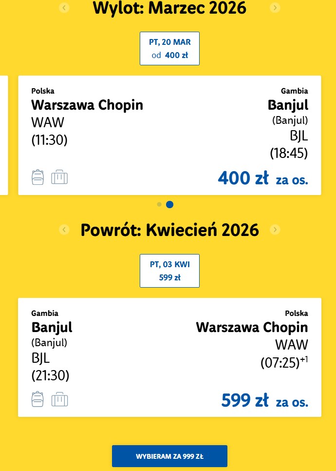 - 🇵🇱Варшава або Катовіце – 🇬🇲Банджул (Гамбія) – 🇵🇱Варшава або Катовіце 20 березня – 3 квітня за 999 злотих (€234) у два боки