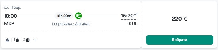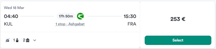 На час публікації найдешевші варіанти є з Куала-Лумпур у Франкфурт. Рейси Turkmenistan Airlines, віза при стиковці не потрібна.