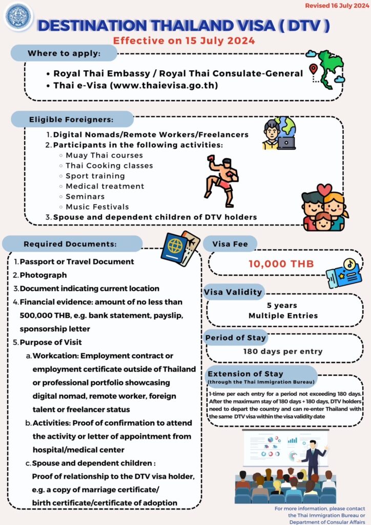 Запроваджено нову DTV візу для тих, хто бажає залишитися в Таїланді з метою роботи та подорожей одночасно (workation). Це стосується висококваліфікованих фахівців, фрілансерів, віддалених працівників або тих, хто хоче залишитися, щоб вивчати тайський бокс і бойові мистецтва, відвідувати кулінарні курси, брати участь у спортивних тренуваннях, проходити медичне лікування, відвідувати навчальні курси, семінари, а також художні та музичні виставки.