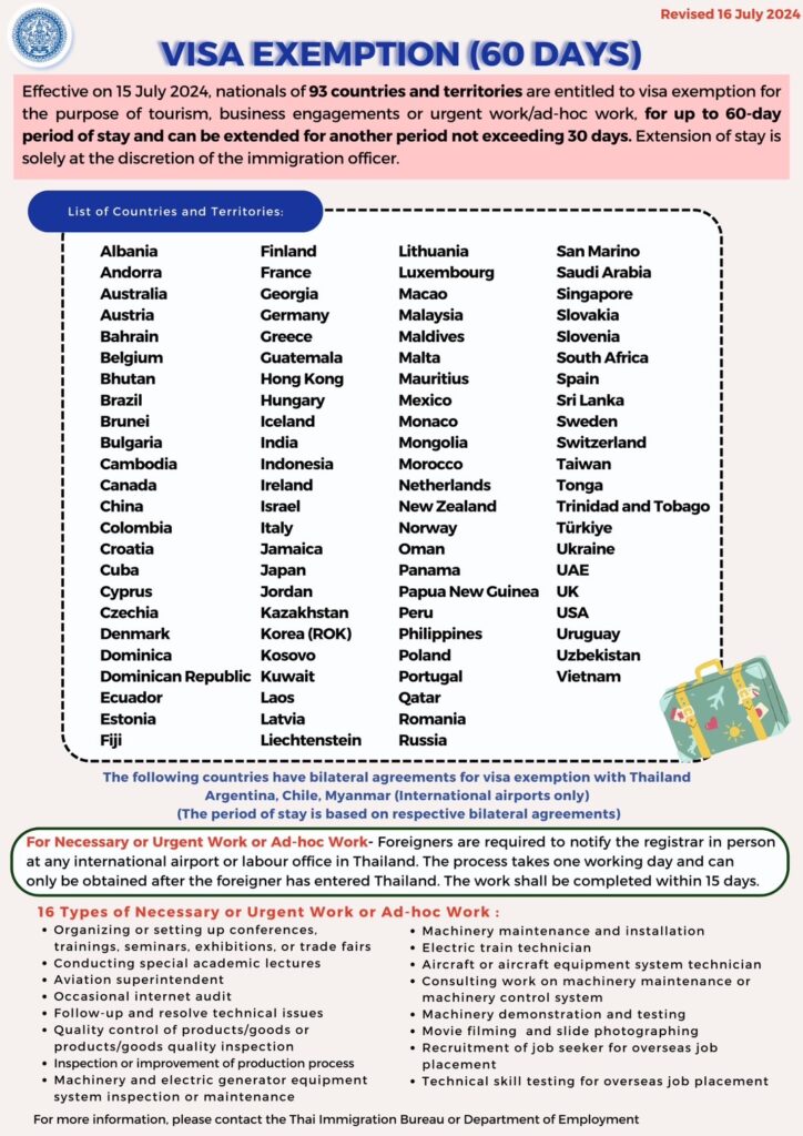 Затверджено перелік країн і територій, власники паспортів яких можуть тимчасово в’їжджати до Таїланду з метою туризму й звільняються від візових вимог, що дозволяє їм перебувати на території Королівства до 60 днів. Наразі список включає 93 країни та території, порівняно з 57 раніше.