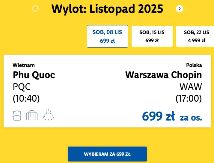 - 🇻🇳Phu Quoc (В’єтнам) – 🇵🇱Варшава за 699 pln (€164) 8 або 15 листопада