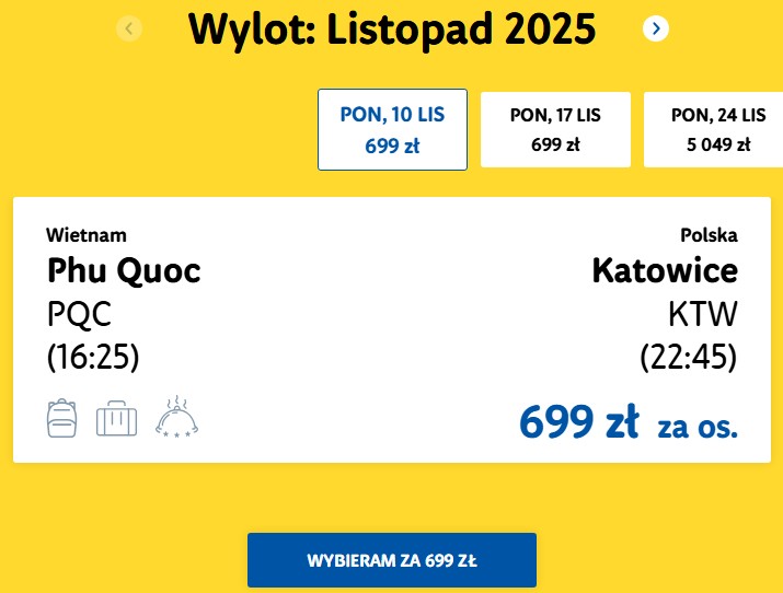 Авіаквитки з В’єтнаму (острів Фукуок (Phu Quoc)) в Польщу можна купити за €164 (699 pln) в один бік! Зауважте, що за найнижчою ціною є квитки лише в один бік у Варшаву 8 та 15 листопада або в Катовіце 10 та 17 листопада.